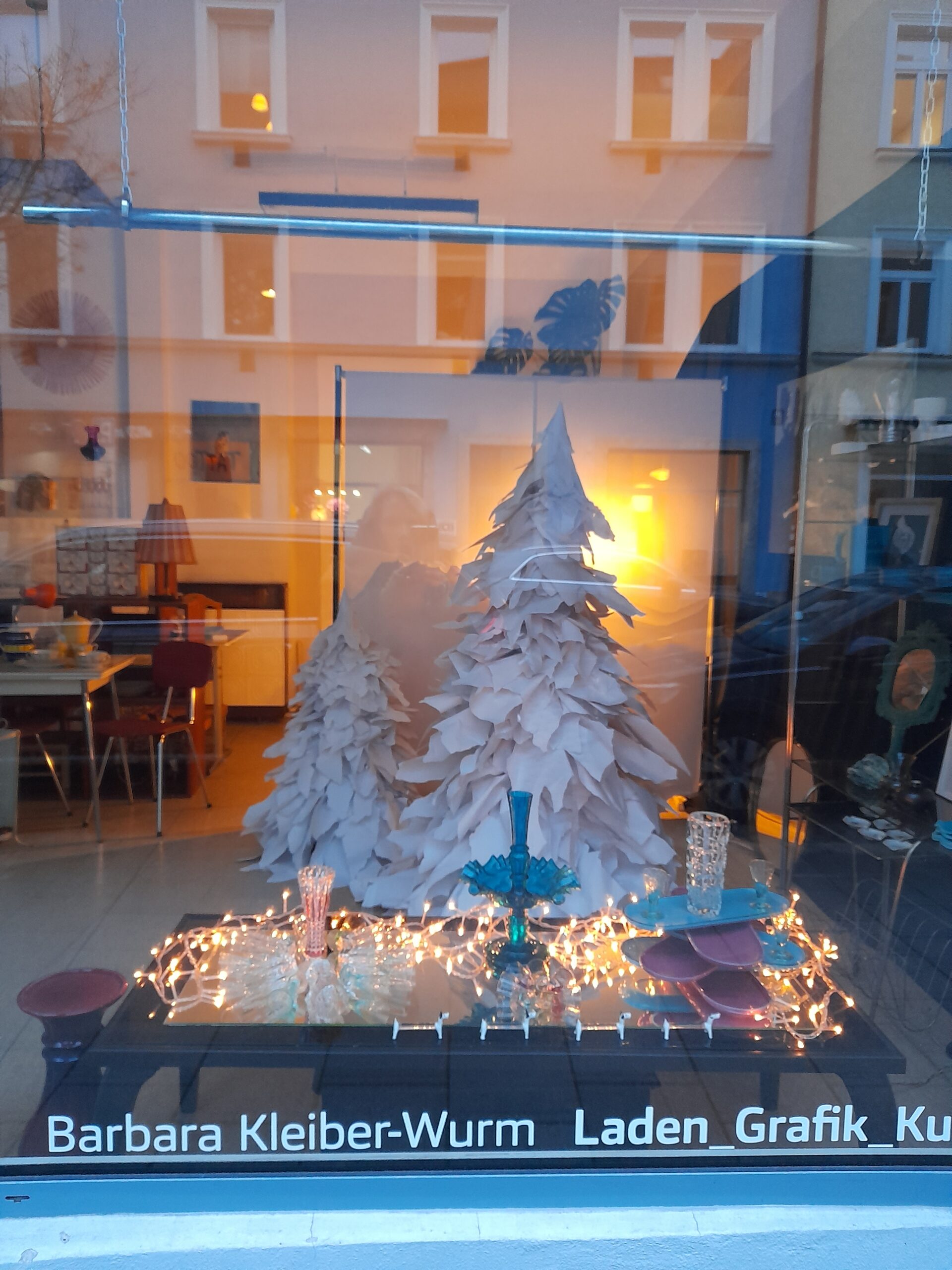 Laden_Grafik_Kunst – der etwas sperrige Name trifft es ganz gut. Zwischen Vintage-Möbeln vergangener Jahrzehnte arrangiert die Ladeninhaberin auch ihre eigenen filigranen Papierobjekte und Zeichnungen. Vor zwei Wochen dekorierte sie gerade um. Auf ihrem Schreibtisch bauschte sich in Fetzen gerissenes Papier zu großen Haufen. Mit beiden Händen griff die Künstlerin hinein, rüschte alles beherzt zusammen wie eine Halskrause und drapierte es um einen robusten Ast, gesammelt im Nachbarwald. Ein hübsch nostalgischer, gusseiserner Baumständer von der Oma gab dem Ganzen Halt. Nun verwandeln zwei leuchtend weiße Tannenbäume den abgedunkelten Galerieladen in eine märchenhaft beleuchtete Winterlandschaft.