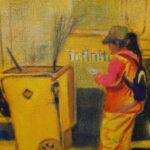 Erst wenn man näher herangeht, zeigt sich: Ihre Malerei, die so faszinierend und anziehend wirkt, hat einen doppelten Boden. Besonders verblüffend ist der Effekt bei einem großformatigen, in allen Rottönen changierenden Gemälde mit prachtvoll gold-glänzendem Rand. Im lodernden Farbenspiel zeichnet sich eine hockende Gestalt ab, ein vor Anstrengung verzerrtes Gesicht schaut mich an: „Hard work for smart phones“ heißt das Bild, mit dem die Künstlerin jene in den Blick nimmt, die für den Rest der Welt die Drecksarbeit leisten.