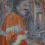 Während wir reden, schaue ich auf ein großformatiges Bild, es lehnt an der Wand. Die Farben sind so anders, fällt mir auf. Nur an einer Stelle schimmern bunte Farbfetzchen hervor. Seit einiger Zeit sortiert Gloria Gans konsequent Bilder aus, die ihr nicht mehr stimmig erscheinen, und übermalt sie. Die fröhlichen Zeiten sind vorbei, signalisiert dieses hier. Dunkle Schwaden strukturieren den aufgewühlten Hintergrund, es könnte Rauch sein. „Was für eine Welt hinterlassen wir unseren Kindern?“, fragt die Malerin. Danke dafür, scheint uns ein wild geschminkter junger Mensch zu zurufen. Er zeigt uns seine ausgestreckte Zunge.