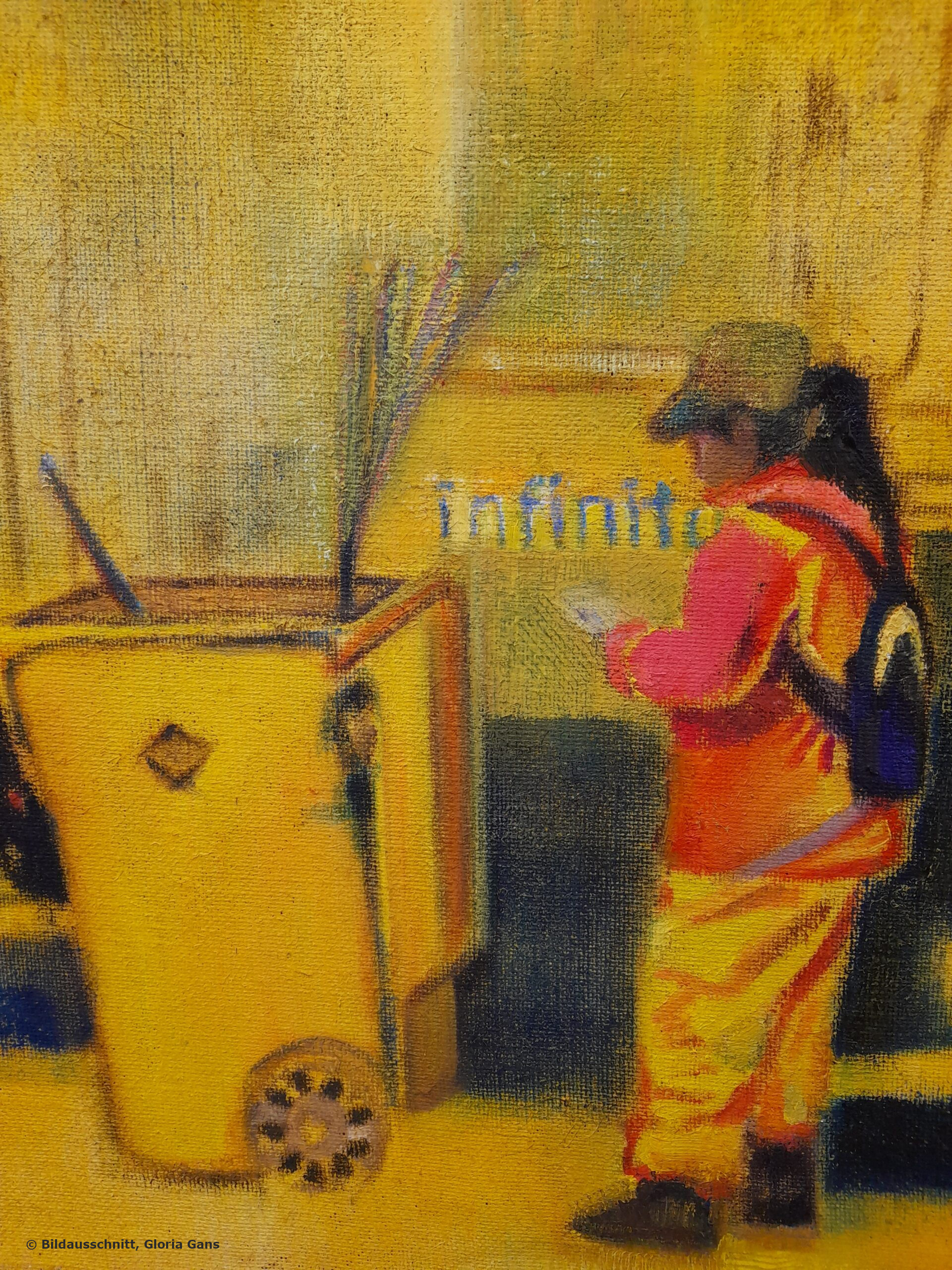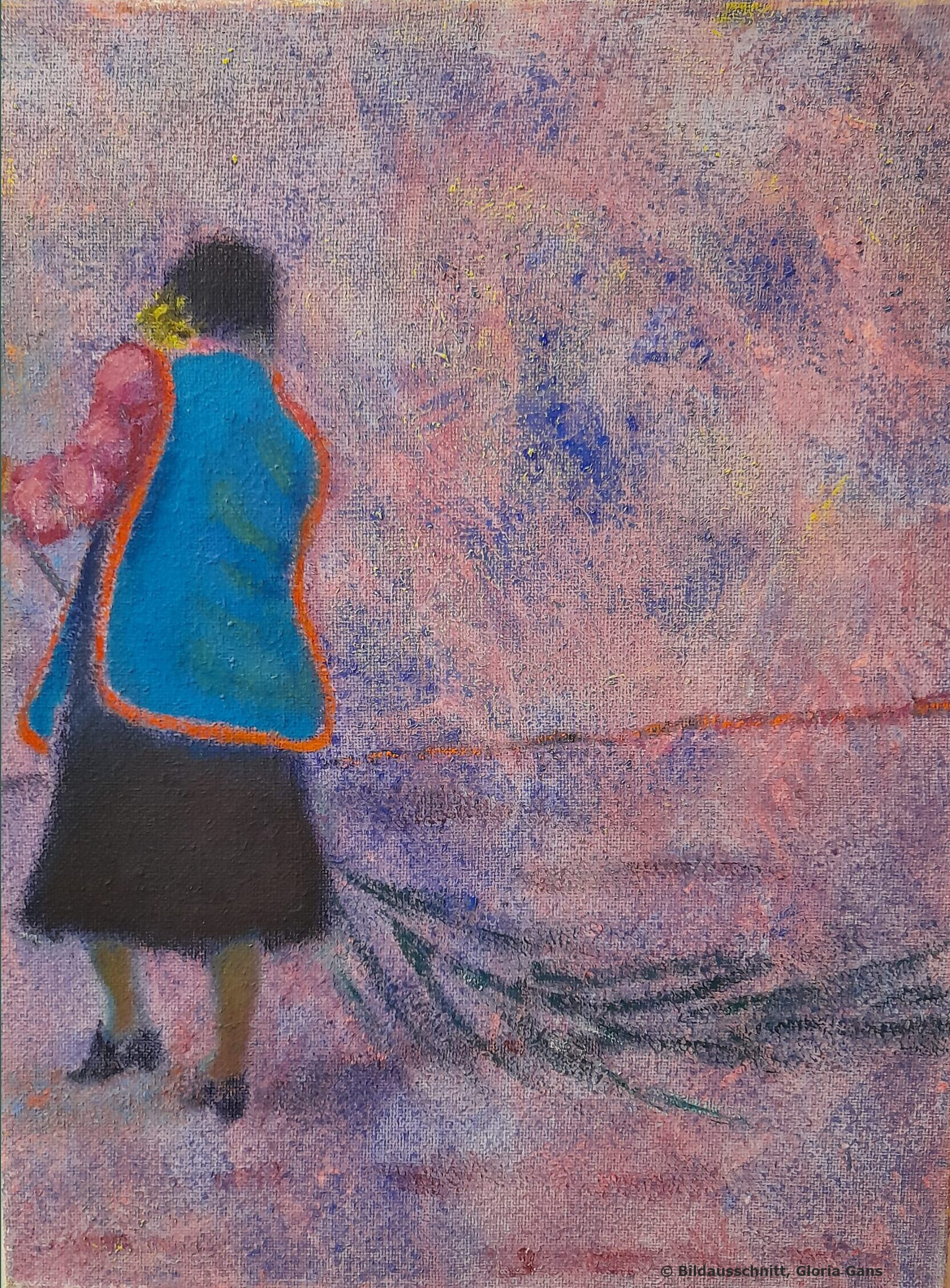 Er steht auch für die Haltung, mit der Gloria Gans in der Welt unterwegs ist. Als Mensch, Malerin und Kunstpädagogin. Wir lernten uns im Turm von St. Clemens in Neuhausen kennen, wo sie als Kunstdozentin der Malakademie des Münchner Bildungswerks arbeitete. Auf dem mit bunten Farbklecksen übersäten Werktisch lag eine Einladung zur Gruppenausstellung mit dem Kolibri-Kunst-Kabinett. Auf dem Flyer ein Paar mit Kind, in einen leeren Raum gestellt. Geflüchtete, auf dem Weg ins Irgendwo. „Wie würde es mir gehen, wenn ich in ein Land käme, das mir völlig fremd ist, wo ich niemanden kenne und die Sprache nicht verstehe?“ Diese Frage treibt die Münchner Künstlerin um.