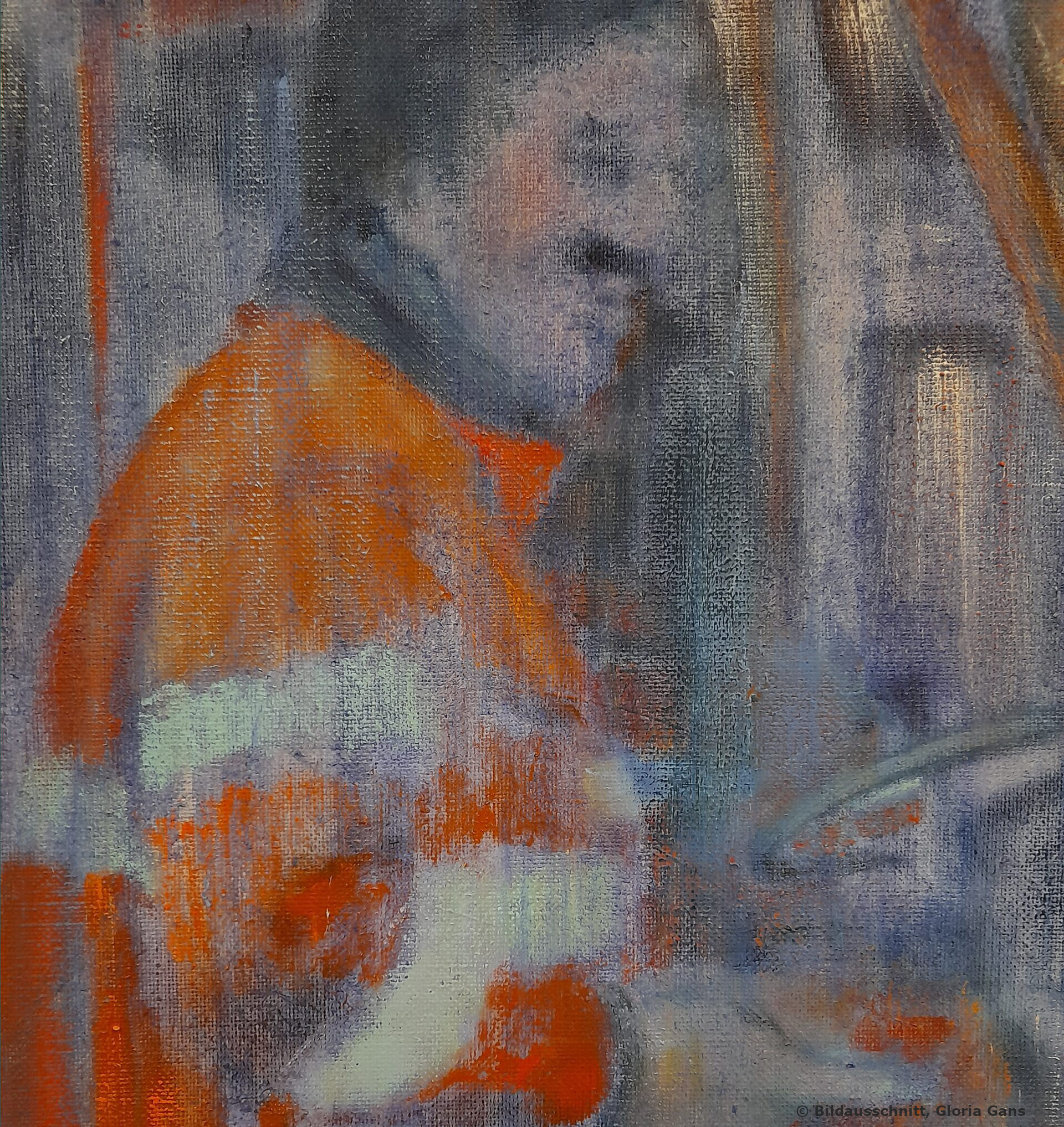 Während wir reden, schaue ich auf ein großformatiges Bild, es lehnt an der Wand. Die Farben sind so anders, fällt mir auf. Nur an einer Stelle schimmern bunte Farbfetzchen hervor. Seit einiger Zeit sortiert Gloria Gans konsequent Bilder aus, die ihr nicht mehr stimmig erscheinen, und übermalt sie. Die fröhlichen Zeiten sind vorbei, signalisiert dieses hier. Dunkle Schwaden strukturieren den aufgewühlten Hintergrund, es könnte Rauch sein. „Was für eine Welt hinterlassen wir unseren Kindern?“, fragt die Malerin. Danke dafür, scheint uns ein wild geschminkter junger Mensch zu zurufen. Er zeigt uns seine ausgestreckte Zunge.